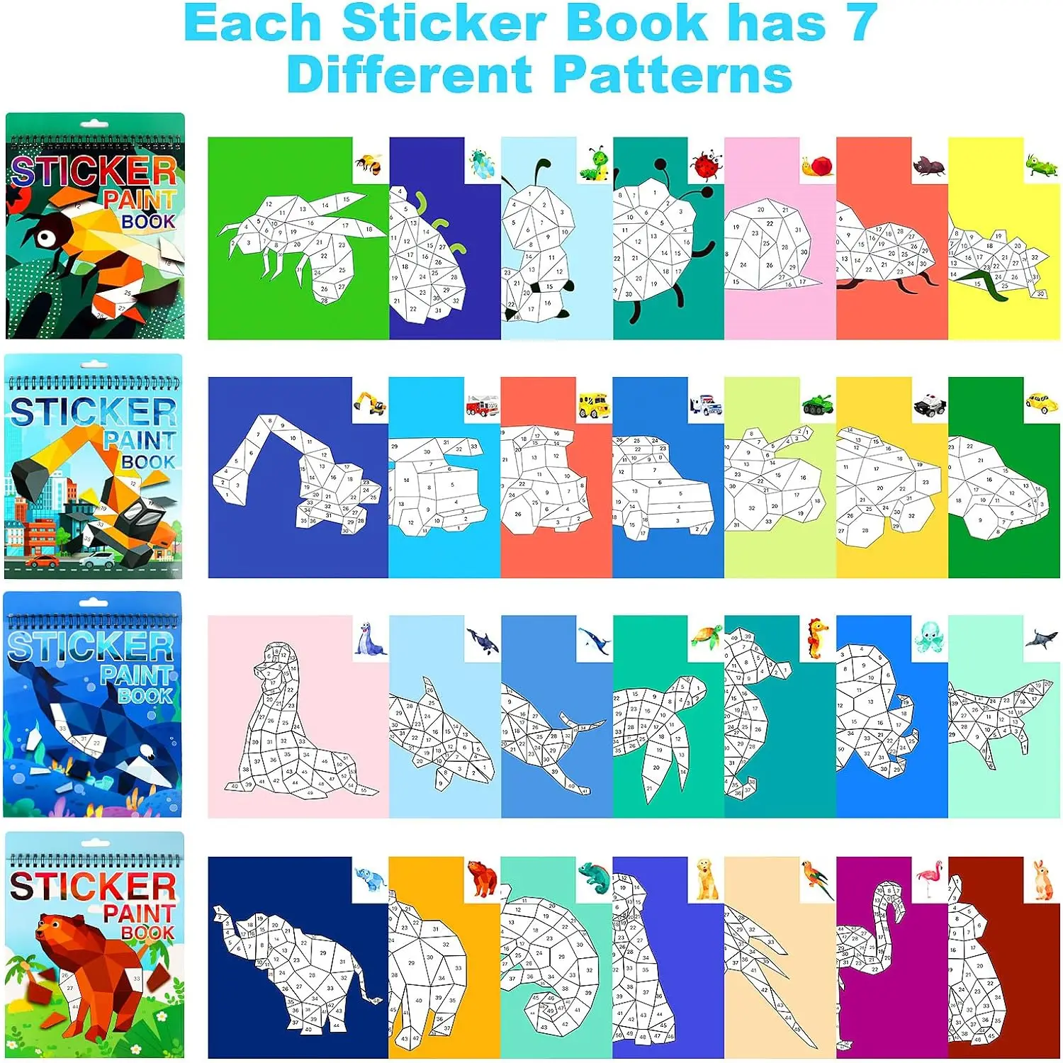 Cada livro de adesivos tem 7 páginas de imagens de animais diferentes, podem ser finalizadas com 7 fotos no total.Todas as páginas são perfuradas.Quando suas crianças terminarem este adesivo em forma, você poderá emoldurá-lo.